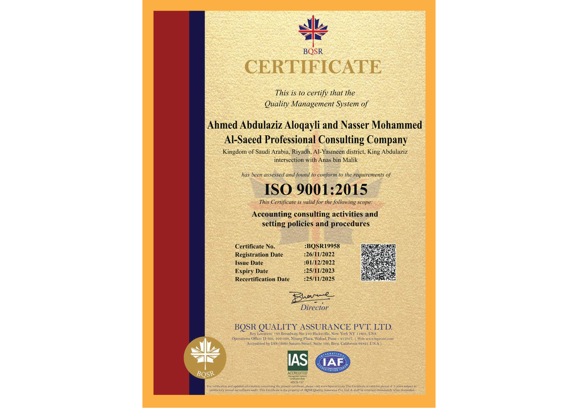 بعد رحلة طويلة من الالتزام بالمهنية وتجارب العمل المستمرة والتعلم من التحديات والصعوبات، وبفضل الله حصلت شركة العقيلي والسعيد وشركاؤهم محاسبون ومراجعون قانونيون بعد التطوير في إدارات الشركة على شهادات نظام إدارة الجودة 9001 ، وهي بمثابة إقرار باستيفاء المنتج لكافة معايير الجودة العالمية الذي تقدمه الشركة، كما نسعى دومًا إلى تحقيق المزيد والارتقاء بمستوى خدماتنا.